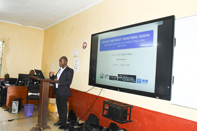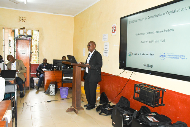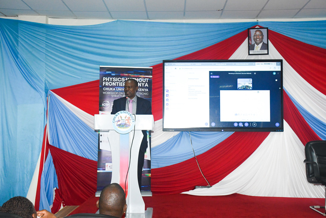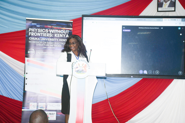 The Department of Physical Sciences commenced its workshop on Electronic Structure Methods, under the theme “Physics Without Frontiers.” The training, which emphasized the pivotal role of physics in advancing scientific and technological progress, was officially opened by the DVC (AFP&D), Prof. Jonah Kindiki. He highlighted the importance of inspiring students to engage with the subject and ensuring they graduate as well-rounded and competitive professionals. Dr. Zipporah Muthui, the Project Coordinator, welcomed the guest speakers, including Prof. Dickson Andala, CEO of NRF-Kenya; Dr. Werner Janse van Rensburg, CHPC Research Manager from CHPC, Cape Town, South Africa; and Prof. Kate Shaw, ICTP-PWF Coordinator from ICTP, Italy, who all delivered their presentations virtually, highlighting the significance of physics in driving innovation. Facilitators led participants through detailed sessions on materials research, critical elements of solid-state physics for crystal structure analysis, and the basics of electronic structure methods. The five-day workshop aims to provide participants with a deeper understanding of advanced scientific concepts, meaningful engagement with leading experts, and hands-on experience in electronic structure methods and solid-state physics.